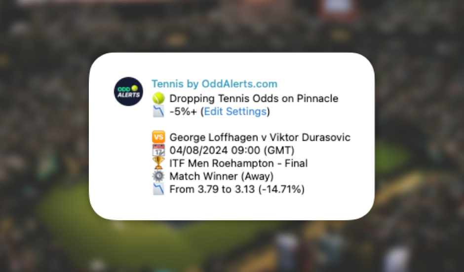 In the summer of 2024, OddAlerts continues to serve up more value to its users, this time with the Tennis hub and connected Telgram bot. The Telegram bot sends you the latest dropping odds from the Tennis world as they happen, allowing you to identify value bets and profit from Tennis.